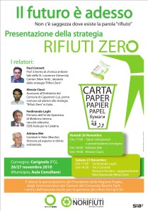 Informare/sensibilizzare la Cittadinanza e gli amministratori su prospettive di sviluppo ecocompatibili e, in particolare, sui vantaggi in termini sanitari, ambientali ed economici di una raccolta differenziata “spinta” col metodo porta-a-porta (l’unico modello in grado di garantire alte percentuali di recycling). Questo è l’obiettivo principe della due giorni di convegno del 26 e 27 novembre a Cerignola (FG). E’ proprio la città di Peppino Di Vittorio ad ospitare un evento che si propone di portata non solo locale, data l’importanza dei relatori e degli invitati. Da “problema” a “risorsa”. I rifiuti, oggi, possono diventare una fonte di ricchezza, che può venire realmente valorizzata solo attraverso il recupero di tutti i materiali. Purtroppo, oggi la media di raccolta dei rifiuti urbani nei Comuni del consorzio ATO Fg/4 appare di molto lontana dal traguardo del 65% entro il 2012 stabilito dal Decreto Ronchi, basato sulla famosa formula delle “3R” (Riduzione, Riuso, Raccolta differenziata) e siamo miseramente intorno al 10%, anche al di sotto della media regionale del 15% (dati Regione Puglia http://www.rifiutiebonifica.puglia.it/ato.php?ato=FG4). Né può servire la costruzione di inceneritori che sono riconosciuti ormai come una soluzione peggiore del male perchè sono fonti di inquinamento atmosferico altamente nocivo per l’ambiente e la salute, e rappresentano un forte disincentivo alla raccolta differenziata. Questa situazione impone da subito il superamento di una “cultura dell’emergenza” in fatto di rifiuti verso nuove soluzioni e stili di vita maggiormente eco-sostenibili. Di qui scaturisce la proposta del Coordinamento “No Rifiuti” del Basso Tavoliere – che riunisce cittadini e comitati dei 9 Comuni (Cinque Reali Siti, Cerignola, San Ferdinando, Trinitapoli e Margherita) dello stesso bacino rifiuti –, consistente nell’adozione da parte di tutte le municipalità del Consorzio della cosiddetta “STRATEGIA RIFIUTI ZERO”, messa a punto da ricercatori di fama mondiale e realizzata già in decine di piccole e grandi città americane, canadesi, australiane e italiane (Capannori, Somma Vesuviana, Melpignano, ecc.). Essa si articola in una serie di tappe che, attraverso la raccolta differenziata domiciliare – ormai attuata con successo da centinaia di Comuni di tutt’Italia –, il passaggio dalla tassa alla “tariffa” individuale, l’esame merceologico dei rifiuti finalizzato alla riduzione a monte degli stessi e il riuso di tutti i materiali, conduce nel giro di alcuni anni all’azzeramento dei rifiuti da destinare a discariche e inceneritori evitando ulteriori danni alla salute delle persone e all’ambiente.