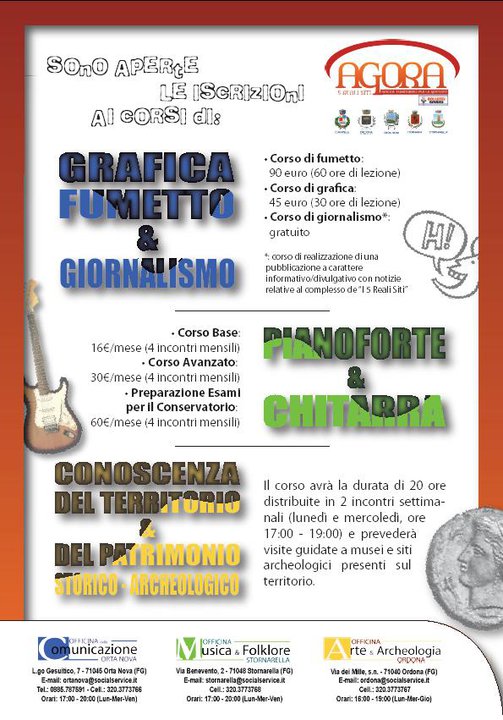 Sabato scorso presso il Palazzo Ex Gesuitico di Orta Nova, si è svolto un incontro pubblico per fare un bilancio delle attività svolte fin ora dal Progetto Agorà della rete dei Bollenti Spiriti, laboratori urbani lanciati dalla Regione Puglia, volti al recupero di strutture in disuso ed a offrire spazi creativi per i giovani. Nello specifico il progetto Agorà ha realizzato nel territorio dei Cinque Reali Siti, tre differenti laboratori, uno ad Orta Nova presso il Palazzo Ex Gesuitico dedicato alla grafica, al fumetto ed al giornalismo, un’altro ad Ordona sito in via dei Mille e dedicato all’Arte ed all’Archeologia e l’altro a Stornarella dedicato alla Musica e più precisamente dedicato ai corsi di Pianoforte e Chitarra. Sebbene il lavoro dei responsabili fino ora sia stato intenso, la partecipazione in questi mesi si è dimostrata piuttosto scarsa, solamente il laboratorio musicale può annoverare fin ora 26 iscritti, mentre negli altri laboratori la presenza di giovani ad oggi sembra davvero un miraggio. Lo stesso incontro, sebbene pubblicizzato con manifesti ed inviti su Facebook, ha avuto una scarsa partecipazione di giovani, dimostrando come una bella opportunità di crescita e di impegno giovanile non sia stata fin ora percepita. All’ incontro erano presenti oltre ai responsabili dei progetti anche il sindaco Peppino Moscarella e l’assessore ai servizi sociali Dino Russo, proprio il sindaco nell’occasione ha voluto puntualizzare come a volte, al lavoro delle istituzioni non ci sia la rispettiva risposta dei cittadini, come purtroppo manifestatosi nell’incontro di Orta Nova, il terzo dopo quelli di Carapelle e Stornara. Nel frattempo il responsabile del progetto Gerardo Consagro, ha illustrato l’obiettivo di far nascere una Consulta Giovanile dei 5 Reali Siti con sede presso il Palazzo Ex Gesuitico, e con l’obiettivo di fornire idee giovani all’unione dei comuni dei 5 Reali Siti, per la verità un progetto simile fu proposto circa tre anni fa da un gruppo di giovani, che in parte poi confluì nel comitato “Salviamo la Nostra Terra” impegnato nella lotta alla discarica di Ferrante. Proprio quel progetto, proposto nel primo incontro informativo dei Bollenti Spiriti, si arenò ancor prima di diventare una realtà, la speranza è che questa sia la volta buona, e che la Consulta abbia lo spazio istituzionale che merita, e che i giovani diano finalmente sfogo ai propri Bollenti Spiriti. Qui a fianco la locandina dei progetti, cliccando sopra è possibile visualizzarne i contenuti per le informazioni sui corsi.