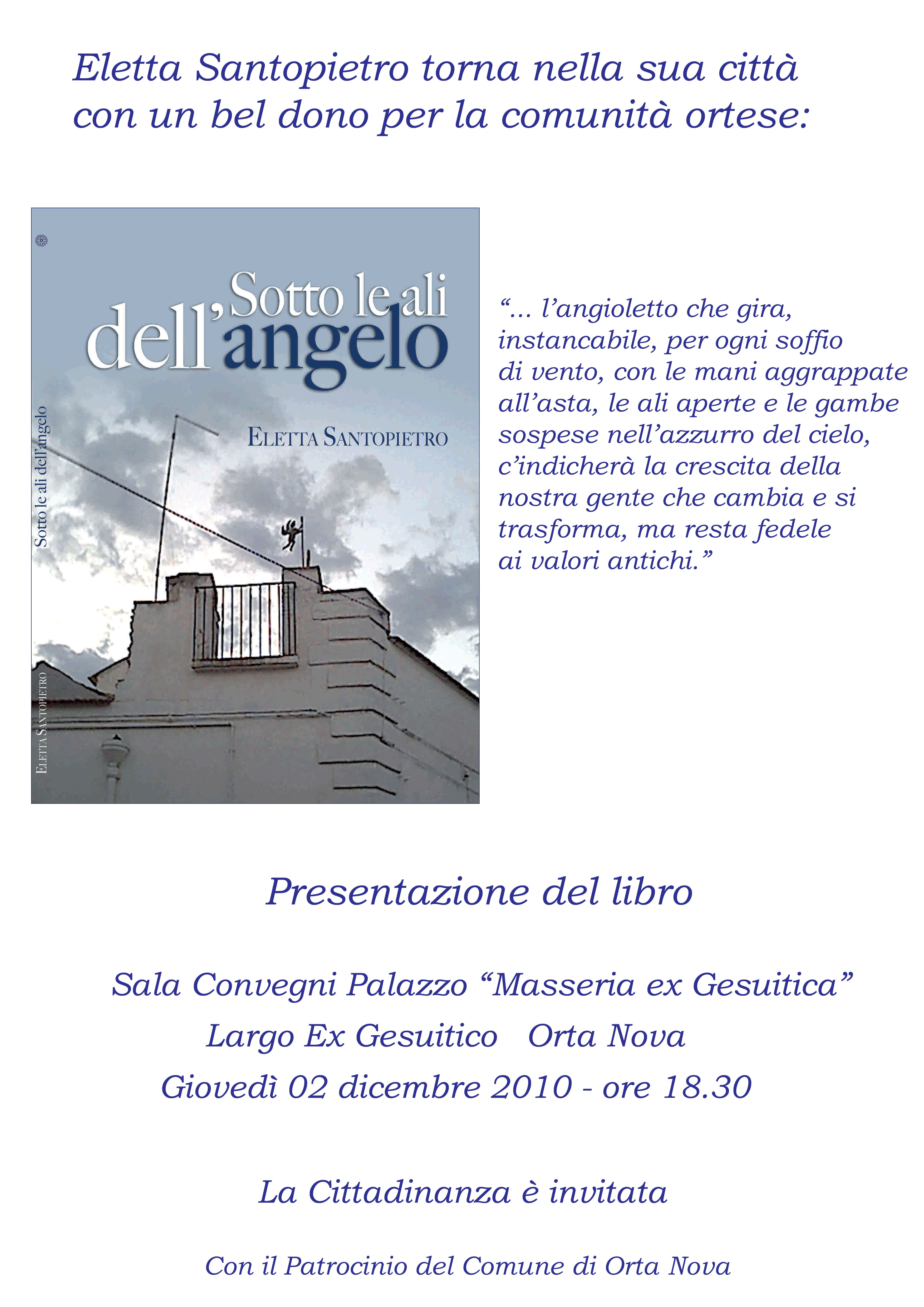 L’angioletto che segna sui tetti la direzione del vento, protagonista di un cambiamento dei tempi ma con la fedeltà ai valori antichi. “Sotto le ali dell’Angelo” e’ l’ultimo libro della scrittrice ortese Eletta Santopietro che torna ad Orta Nova per presentare la sua ultima opera, l’evento è previsto per le 18:30 di questa sera presso la sala conferenze del Palazzo Ex Gesuitico. Da sempre la scrittrice ortese studia e racconta gli aspetti storici della nostra città, e questa ennesima opera vuole ancora una volta omaggiare la città natale della scrittrice. L’evento è patrocinato dall’Amministrazione Comunale.