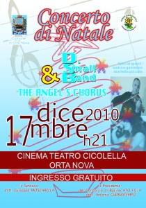 Appuntamento con la musica questa sera al Cineteatro Cicolella di Orta Nova, per il concerto di Natale organizzato dal Consorzio Ato Fg 4 e dall’ Amministrazione Comunale di Orta Nova. All’ importante evento prenderanno parte i sindaci e le amministrazioni dei dieci comuni che compongono il Bacino Ato Foggia 4, saranno presenti anche il sindaco di Orta Nova Giuseppe Moscarella ed il sindaco di Cerignola, nonchè presidente del Bacino Ato Fg 4, Antonio Giannatempo. Lo spettacolo prevede l’esibizione della D.Small Band e della The Angel’s Chorus, con la partecipazione del violinista Andrea Gammino e della cantante Mariella Pizzolo, che si esibiranno con celebri brani dedicati al natale. L’ ingresso allo spettacolo è gratuito, sipario alle 21:00.