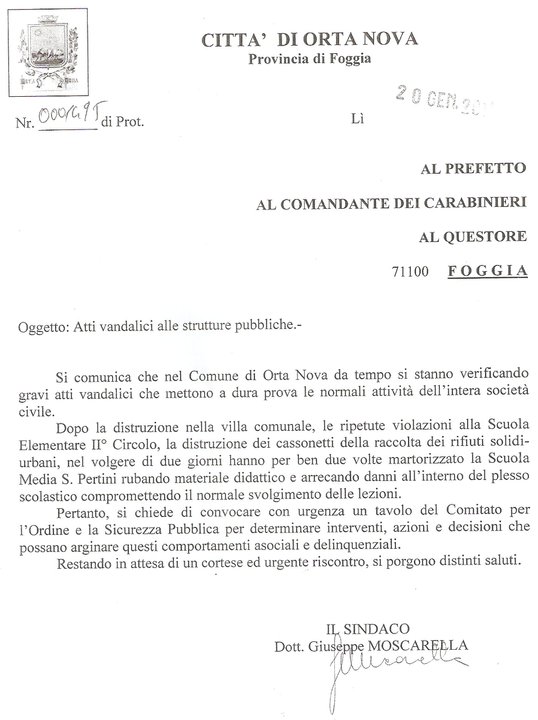 Ancora una volta viene presa d’assalto la Scuola Media S. Pertini, stanotte ladri si sono intrufolati ed hanno rubato i computer e materale didattico. Dopo la distruzione nella villa comunale, le ripetute violazioni alla scuola Elementare II° circolo, la quale è stata da poco ristrutturata, la distruzione dei cassonetti della raccolta rifiuti solidi urbani, nel volgere di due giorni hanno per ben due volte martorizzato la Scuola Media S. Pertini. Il Sindaco Moscarella dopo ripetuti colloqui con le Istituzioni per garantire la Sicurezza e l’Ordine Pubblico, ha inviato una lettera denuncia al Prefetto, al Comandante dei Carabinieri, al Questore di Foggia, denunciando i continui atti vandalici a danno delle strutture pubbliche, convocando un tavolo del Comitato per l’Ordine e la Sicurezza Pubblica, per arginare questi atti delinquenziali che colpiscono profondamente la nostra comunità.