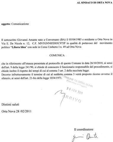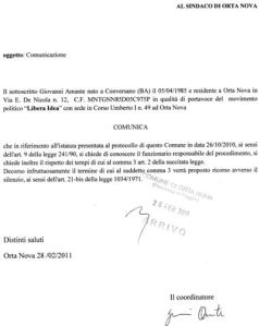 Il 26 Ottobre 2010 è stata protocollata presso l’ufficio protocolli del comune di Orta Nova una delibera di iniziativa popolare che Libera Idea ha redatto con la sottoscrizione di 200 firme di ortesi per chiedere all’amministrazione maggiore trasparenza attraverso la trasmissione in rete delle riunioni del Consiglio Comunale e la pubblicazione delle Determine Dirigenziali. La richiesta è stata avanzata in quanto Libera Idea si fa promotrice di una politica più trasparente, sostenendo una maggiore conoscenza e coinvolgimento della popolazione ortese alla gestione della cosa pubblica, anche tra i cittadini più giovani che utilizzano moderni strumenti tecnologici di informazione. Il documento in oggetto non costituiva una semplice petizione popolare, ove non vi è l’obbligo da parte dell’amministrazione di risposta, bensì una delibera popolare che necessita di una risposta entro 60 giorni. Vista l’inadempienza e indifferenza del Sindaco Moscarella e del consiglio comunale in tale periodo di tempo, e poiché Libera Idea si sente responsabile dei 200 ortesi che hanno manifestato la volontà di aver diritto ad una maggiore trasparenza, ha il dovere morale di rendere manifesta questa grave inadempienza. Infatti ha sollecitato ulteriormente in data 28 Febbraio 2011. Libera Idea esprime il suo rammarico in quanto si augurava una maggiore attenzione da parte del Comune, vista la finalità di queste firme orientata a garantire maggiori diritti e maggiore trasparenza alla collettività ortese.