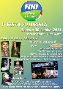 Sarà una serata all’insegna dell’imitazione quella che si terrà stasera in Piazza Pietro Nenni ad Orta Nova. Infatti, durante la prima edizione della “Festa Futurista”, organizzata dalla sezione ortese di Fli, si esibiranno molti artisti provenienti direttamente dalla VI edizione del Festival dei sosia di Bibione: Ligadue, sosia diLigabue, Beppe Ferrante, sosia di Albano, Miky La Gianna, sosia di Gianna Nannini, Francesco Rinaldi, sosia di Edoardo Bennato e Rocco Magnante, sosia di Zucchero nonché vincitore dell’ultima edizione del Festival. L’accompagnamento musicale sarà curato dalla band ortese, No Name Orchestra, rientrata anch’essa dalla kermesse musicale veneta. Obiettivo della festa? «Ricostruire il centrodestra di Orta Nova», afferma l’organizzatore, Alfredo Ballatore.