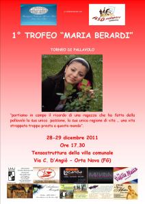 Sarà organizzato il 28 e il 29 dicembre, alle ore 17.30 presso la tensostruttura della villa comunale, il 1° Trofeo intitolato a Maria Berardi, la ragazza deceduta a 15 anni lo scorso 1 novembre in seguito ad un incidente stradale. Maria apparteneva alla squadra di volley femminile della nostra città, e la pallavolo era tutta la sua vita. E’ per questo che l’Associazione Culturale “Le nove Muse”, nella persona del suo presidente, Andrea Zicolillo (in collaborazione con la A.S.D. Realsport Orta Nova) ha deciso di istituire questo premio in modo che la sua memoria e la sua passione per lo sport non vengano mai dimenticati negli anni a venire; ed è anche un regalo che tutti noi, con la nostra partecipazione, vogliamo lasciare a Maria, e in modo particolare alla famiglia, per questo Natale.