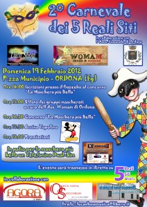 Sarà Ordona domenica prossima ad ospitare la II Edizione del Carnevale dei 5 Reali Siti, manifestazione organizzata dalla Luca Show Organizzazione Eventi, in collaborazione con l’Associazione Womam di Ordona e l’amministrazione comunale della cittadina dei 5 Reali Siti. L´evento giunge alla seconda edizione, a distanza di un anno da quella organizzata ad Orta Nova. La manifestazione prevederà due fasi, la prima avrà inizio intorno alle 15:00, con la sfilata per le vie della città dei gruppi mascherati organizzati dall´associazione Womam, a seguire in piazza Municipio il premio ‘La Maschera più bella’, con le premiazioni, le mascotte e la musica. Il tutto sarà trasmesso in diretta su 5 Reali Siti Web Tv.
