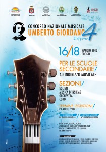 organizzato dall’Associazione Musicale I Suoni del Sud e dall’Università degli Studi di Foggia avrà sede proprio a Foggia, nell’Aula Magna della Facoltà di Economia (dal 16 al 18 maggio 2012). Le iscrizioni scadranno il 23 aprile 2012: “Abbiamo affrontato l’iniziativa con la dovuta serietà e professionalità, cercando le necessarie collaborazioni con le scuole, nessuna partecipazione con gli enti locali, ma molta sensibilità verso tali forme di crescita culturale con l’Università degli Studi di Foggia, possiamo dire con orgoglio che, alla luce di quanto detto, il risultato è stato gratificante”, spiegano i promotori del concorso Gianni Cuciniello (Presidente) e Lorenzo Ciuffreda (Direttore Artistico). “Il Concorso Musicale è rivolto ad alunni e docenti delle scuole ad indirizzo musicale operanti sul tutto il territorio nazionale. L’esperienza maturata nel corso della passata edizione, ci ha lasciato in eredità l’entusiasmo di tutti i partecipanti, in migliaia tra dirigenti, docenti, genitori provenienti da tutta l’area centro-sud e rappresentanti degli enti locali che, a vario titolo, si sono interessati e prodigati fattivamente nel soddisfare la voglia di quanti, attraverso la musica, offrono agli alunni delle diverse scuole convenute l’opportunità di comunicare e confrontarsi in attività extra scolastiche”. Anche per la quarta edizione l’obiettivo del concorso è quello di valorizzare il lavoro svolto dai docenti e alunni nell’ambito delle scuole a indirizzo musicale e di consentire ai giovanissimi interpreti di confrontarsi in un ambito extra scolastico. La domanda di iscrizione dovrà pervenire all’Associazione Musicale “I Suoni del Sud”, in piazza Cesare Battisti 35, a Foggia, entro lunedì 23 aprile 2012 e dovrà essere anticipata via fax allo 0881.722706. Il regolamento completo del concorso è scaricabile dal sito   http://www.concorsomusicaleumbertogiordano.it.