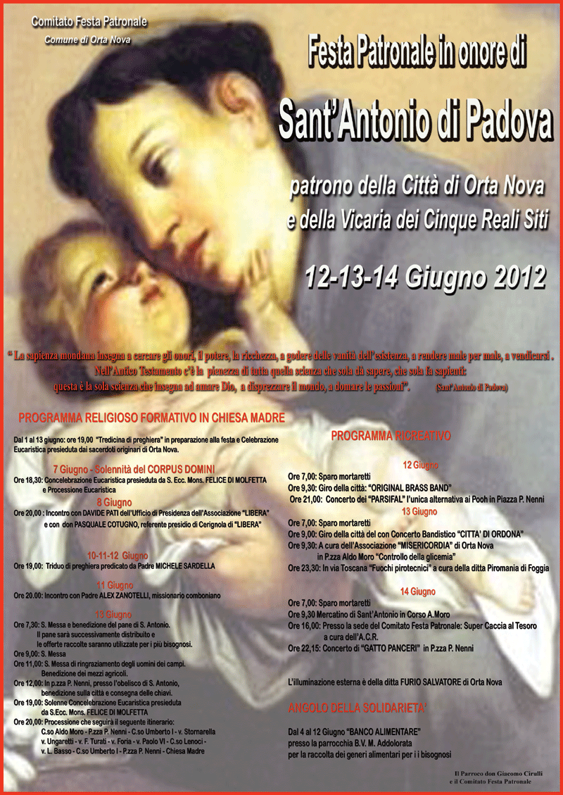 La festa patronale è il 13 giugno, Sant’Antonio da Padova. Se è vero che il budget disponibile è esiguo, la scelta non è male. Meglio feriti che morti…..PS. da molto tempo si consiglia al comitato F.P. (spero che leggano i commenti) di destinare un angolino della festa a qualche artista locale….!!!!