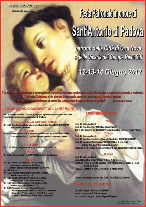 Premetto di non far parte del Comitato feste Patronali , però prima di dare i giudizi sul comitato Feste patronali, leggete almeno i commenti degli altri interlocutori e poi tirate le somme. Come si fa ad andare a chiedere i soldi per Sant’ Antonio se contemporaneamente in un’altra parrocchia stanno raccogliendo i soldi per la festa di Santa Rita? Purtroppo, come dicevo prima Orta Nova è il paese di tutte le feste, e quella Patronale va a chiudere tutte le feste e quindi non ci sono i soldi. perchè sono finiti…….