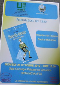 Stasera alle ore 18.30 presso la Sala Convegni Palazzo ex Gesuitico di Orta Nova (Fg) si terrà la presentazione del libro “Pinocchio ritrovato – La forza di riconoscersi burattino” dello scrittore originario di Orta Nova Savino Roggia, organizzata da Università della Terza Età – Sezione di Foggia – Sede di Orta Nova col patrocinio del Comune di Orta Nova. All’incontro parteciperanno, oltre all’autore, la prof.ssa Rina Di Giorgio Cavaliere, presidente dell’Unitre, il giornalista Michele Campanaro, direttore de Lo Sguardo Sui Cinque Reali Siti e la dott.ssa Maria Rosaria Calvio, sindaco di Orta Nova. Durante la serata saranno letti alcuni brani tratti dal libro.