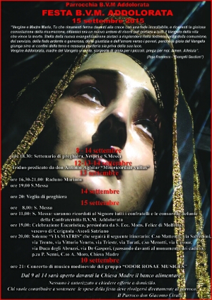 In occasione della ricorrenza della Madonna Addolorata, quest’oggi presso la Chiesa Madre di Orta Nova si svolgeranno le celebrazioni religiose dedicate alla Vergine. Il programma prevede due messe nella mattinata, una alle 8:00 e l’altra alle 11:00 con la partecipazione di tutti i confratelli della confraternita dedicata alla madonna. Nel pomeriggio alle 19:00 la SS Messa officiata dal Vescovo SSEE Felice di Molfetta, a seguire la Via Matris che porterà la statua della Vergine per le vie della città, una splendida raffigurazione portata in processione nei riti della settimana santa.