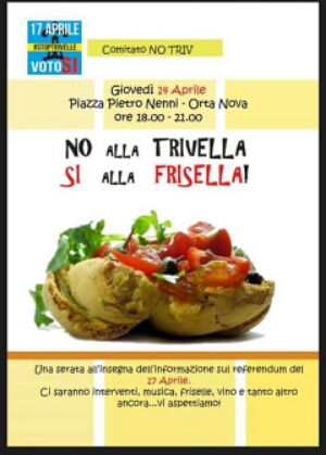 Il comitato ortese a favore del Si al referendum di domenica contro le Trivellazioni in Mare ha organizzato per questa sera in Piazza Pietro Nenni a partire dalle 18:00 l’evento “No alle Trivelle, Si alle Friselle”. Una serata dedicata all’informazione a riguardo del referendum di domenica, accompagnato da friselle, vino e musica per coinvolgere la comunità ortese a riguardo di un tema importante per la difesa del mare e dell’ambiente.
