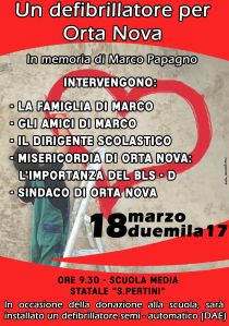 Questa mattina alle 9:30 presso la Scuola Media Statale Sandro Pertini di Orta Nova, avrà luogo l’evento “Un defribrillatore per Orta Nova”, nel ricordo di Marco Papagno, giovane ortese stroncato un anno fa da un infarto. All’evento parteciperanno la famiglia Papagno, gli amici, la direzione scolastica dell’istituto, la Misericordia di Orta Nova ed il sindaco Dino Tarantino. Nell’occasione sarà donato all’istituto scolastico un defribrillatore semi automatico.