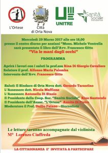 Si parlerà di violenza sulle donne questo pomeriggio alle 18:00 presso il Centro Diurno per Anziani Mons. Michele Ventrella di Orta Nova, nell’ambito della presentazione del libro scritto dall’Avv. Francesco Gitto “Via le mani dagli occhi”. Interverranno durante l’incontro l’autore dell’opera, la Prof.ssa Rina Di Giorgio Cavaliere, il Prof. Alfonso Palomba, il sindaco Dino Tarantino, gli assessori Nicola Maffione e Antonella Di Stasio, il presidente dalla Coop. Sanità Sociale Rino Santorufo, il presidente dell’Associazione L’Ortese Annito Di Pietro, che ha organizzato l’evento, modererà l’incontro il giornalista Duilio Paiano, le letture saranno invece accompagnate dal violino del Prof. Lorenzo Ciuffreda. L’evento sarà trasmesso in differita su Blog Tv.
