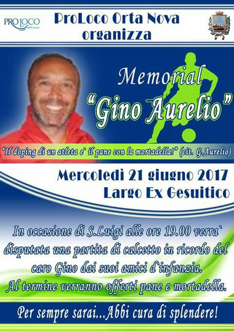 L’estate tra le tante attività programmabili è sicuramente il periodo migliore per giocare a calcio per strada, e con lo stesso spirito di tanti ragazzi che terminata la scuola si sfidano in strada, questo pomeriggio alle 19:00 presso il Largo Gesuitico ad Orta Nova, si sono dati appuntamento gli amici di Gino Aurelio, indimenticato protagonista dello sport ortese e dell’intera capitanata. L’evento è stato organizzato dalla Pro Loco di Orta Nova, che al termine distribuirà a tutti i partecipanti pane e mortadella, il “vero doping” così come ironicamente ricordava il Maestro Gino Aurelio, che attraverso lo sport rivivra’ quest’oggi nello spirito di chi parteciperà all’evento.