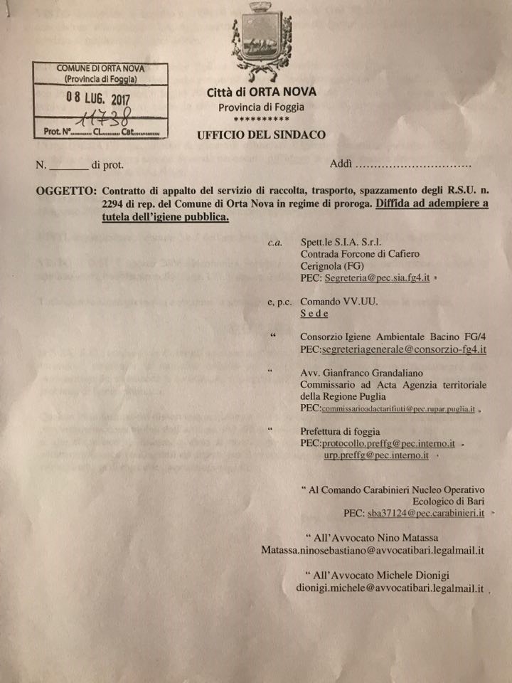 Orta Nova l’amministrazione Tarantino attacca SIA e il consorzio: “Basta ricatti e falsità, il Comune ha sempre pagato con regolarità”
