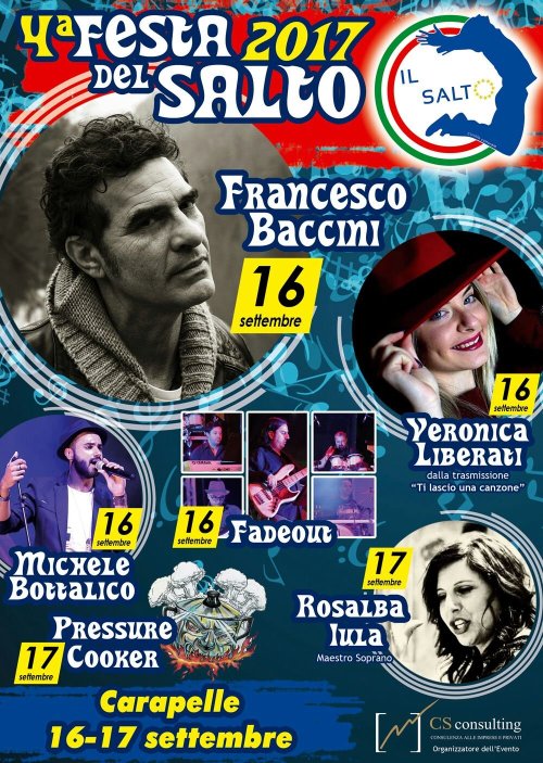 Appuntamento con la festa del Movimento Politico Il Salto questa sera in Piazza Papa Giovanni Paolo II a Carapelle. L’ospite principale della serata sarà il cantautore genovese Francesco Baccini che si esibirà insieme ad altri ospiti come Michele Bottalico, i Fade Out e Veronica Liberati dalla trasmissione televisiva “Ti lascio una canzone”. L’occasione sarà utile per fare il punto in vista della prossima campagna elettorale per il rinnovo del consiglio comunale, con la lista del probabile candidato sindaco Umberto Di Michele. Domani invece la seconda serata con l’esibizione dei Pressure Cooker e del Maestro Soprano Rosalba Iula. L’evento è organizzato dalla CS Consulting.