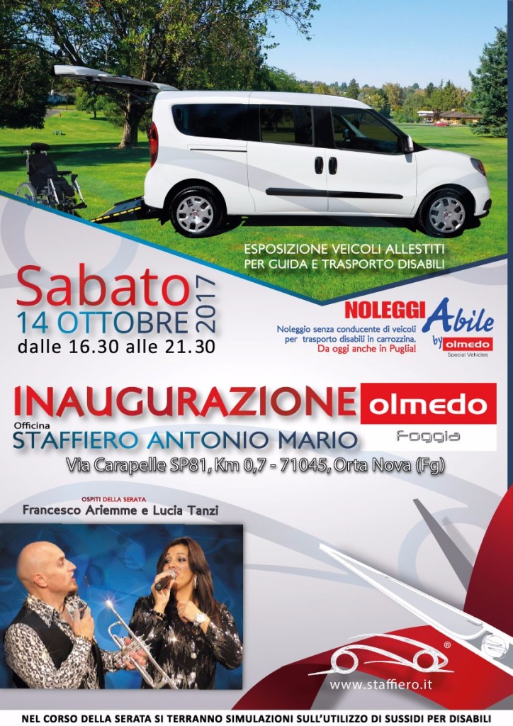 Una nuova freccia nell’arco dello storico centro riparazioni “Staffiero Antonio Mario” di Orta Nova (FG). Il prossimo 14 ottobre, all’interno della sede di Via Carapelle (SP 81, km 0,700), si terrà un evento pubblico che sancirà la nascita di una nuova partnership commerciale con la Olmedo S.p.a., un brand leader in Europa per la trasformazione di veicoli ad uso privato e collettivo per il trasporto disabili. L’azienda con sede principale a Ghiardo di Bibbiano, in provincia di Reggio Emilia, inaugurerà un primo presidio in provincia di Foggia, consegnando alla ditta ortese un nuovo core business da sviluppare attraverso l’esposizione e la vendita di veicoli già convertiti, ma anche attraverso la conversione di veicoli tradizionali. “Siamo molto orgogliosi di inaugurare un Olmedo Point ad Orta Nova, in provincia di Foggia – dice Roberto Rinaldi, Responsabile Commerciale di Olmedo – in questo modo, dopo Catania, Padova e Pescara arriviamo anche in Puglia. L’esigenza della nostra azienda è quella di essere sempre più vicina e a completa disposizione della clientela e per fare questo occorre essere presenti sul territorio Italiano in punti strategici e con collaboratori di alto livello”. Da qui è nata la partnership con l’officina Staffiero dell’omonima famiglia con la quale, già dal 2016, era partita una prima collaborazione finalizzata all’allestimento di un “punto specialistico” per l’esposizione, test drive, consulenza, vendita e noleggio di veicoli trasformati per il trasporto di persone in carrozzina. Dopo l’evento del 14 ottobre, la sede di Orta Nova ospiterà in pianta stabile un vero e proprio concessionario al servizio della disabilità che, come avviene per le case automobilistiche convenzionali, guiderà il cliente alla migliore soluzione per le proprie esigenze. L’Olmedo Point Foggia offrirà, inoltre, la possibilità di installazioni ed assistenza di sistemi di guida, ausili alla risalita ed allestimenti su veicoli con pedana. “Siamo sicuri – conclude Rinaldi – che la professionalità e la competenza della famiglia Staffiero saprà soddisfare le esigenze di un territorio che, per storicità, è da sempre attento ad un mercato in grande evoluzione”. La serata del 14 ottobre sarà, quindi, un primo open store dedicato alla promozione e alla diffusione delle tante novità di casa Staffiero, tra intrattenimento e spazi tematici di approfondimento. Alle ore 16:30 è prevista l’accoglienza degli ospiti, alla quale seguirà una presentazione del progetto Olmedo, partendo dal target aziendale per giungere alle ultime idee di sviluppo. Nel corso di questo dibattito, aperto al pubblico, si terranno delle simulazioni di utilizzo degli ausili per la disabilità, nonché verranno esposte nel dettaglio le peculiarità del servizio NoleggiAbile, primo noleggio senza conducente in tutta la Puglia dedicato ai disabili in carrozzina. Al termine è prevista una degustazione di prodotti tipici locali allestita dall’APS Only Food presieduta da Ilenia Diana. La Cantina Ladogana di Orta Nova metterà a disposizione gli imbottigliati di pregio che caratterizzano il brand “Sessantapassi”. Ad allietare ulteriormente lo spettacolo conclusivo affidato all’estro musicale del noto trombettista, Francesco Ariemme, accompagnato dalla voce di Lucia Tanzi. Il centro riparazioni Staffiero Antonio Mario, oltre alla tradizionale assistenza post vendita di veicoli ordinari, ha sviluppato negli anni una certa sensibilità verso il mondo della disabilità. In modo particolare si menziona la grande iniziativa sportiva “Perché è normale essere speciali”, divenuta un must delle discipline paraolimpiche e proposta all’interno del CUS di Foggia. “Oggi a distanza di quasi mezzo secolo e due generazioni dalla fondazione ad opera di nostro padre Antonio Mario – spiega Nicola Staffiero – la nostra azienda è diventata un riferimento per le riparazioni a 360° nel mondo dell’auto e dei veicoli commerciali. Questo anche grazie all’impulso innovativo dei miei due fratelli, Luigi e Daniele. Oggi la nostra ditta fa un passo decisivo verso il futuro applicando la propria professionalità al mondo dei veicoli dedicati alle persone con disabilità”.