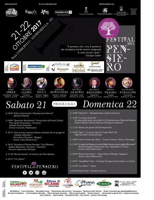 La locandina dell’eventoAlimentare e diffondere la forza del Pensiero sfiorando parole, musica, arte e innovazione.Sabato 21 e domenica 22 ottobre, Stornarellaospiterà laprima edizione del Festival del Pensiero. Promosso dall’Associazione Attivamente in collaborazione con la ProLoco di Stornarella, la Cooperativa Social Service e con l’Arci Travel di Stornara, il centro cittadino si trasformerà nel salotto della riflessione.Sabato 21 saranno gli scrittori,Pino Aprile e Antonio Ciano, a discutere sul tema “Questione Meridionale: l’invenzione dell’Italia Unita”. Seguiranno due presentazioni di libri: lo scrittore e bloggerPiero Riccacon “Alza la testa. I potenti italiani contestati da un gruppo di cittadini informati”, condurrà Enrico Ciccarelli; eAdelmo Monachesecon “Attentato al Piccolo Principe”, condurrà Vincenzo Signoriello. La prima serata si concluderà con “Ho sete ancora”, uno spettacolo tra parole e musiche per ricordare Pino Daniele.La seconda giornata, domenica 22 ottobre, si aprirà alle ore 10 con l’estemporanea di pittura “LiberArte” con artisti provenienti non solo dalla provincia di Foggia. Sempre in mattinata, gli alunni delle classi prime della scuola di I grado dell’Istituto comprensivo Aldo Moro di Stornarella decoreranno l’Albero del Pensiero con frasi analizzati attraverso temi trattati nell’ambiente scolastico. Nel pomeriggio, l’Officina della Comunicazione presenterà Appò, l’applicazione che sintonizza i Cinque Reali Siti. Seguirà la presentazione del libro del paesologo Franco Arminio, “Cedi le strade agli alberi”. Ad arricchire la serata ci sarà una conversazione, curata da Natale Labia, con il magistrato della Procura della Repubblica di Trani, Michele Ruggero, sulla crisi del Debito Sovrano. Alle 20, toccherà al filosofo e saggista, Diego Fusaro con la presentazione del libro “Pensare altrimenti”. A concludere la sezione dei dibattiti sarà il giornalista e scrittore Gianluigi Paragone con Gang Bank tour. A calare il sipario della prima edizione del Festival del Pensiero ci penserà la musica live di Francesco Pelullo dei Ruah. Il Festival del Pensiero è patrocinato dal Comune di Stornarella, dall’Unione dei Cinque Reali Siti, dall’assessorato allo studio lavoro e formazione della Regione Puglia e dal Senato della Repubblica.