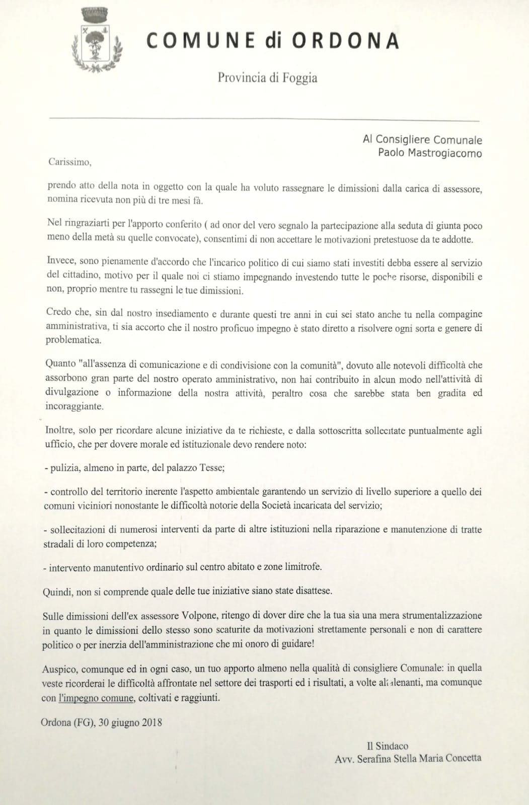 Ordona, il sindaco Serafina Stella risponde alle dimissioni dell’assessore Mastrogiacomo