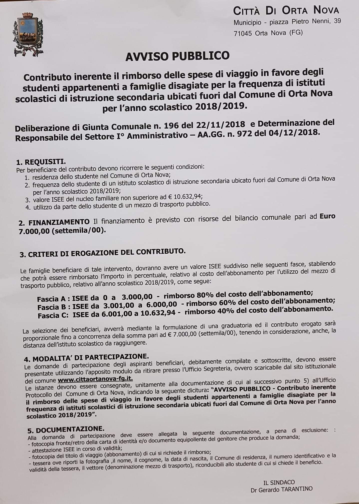 Tra le misure indirette a sostegno del reddito dei nostri concittadini, in concomitanza con gli assessorati ai Servizi Sociali e alla Cultura, quest’anno abbiamo introdotto il contributo per le spese di viaggio in favore degli studenti pendolari. Molti di noi sicuramente hanno figli che, ogni giorno, sono costretti a recarsi nei vari istituti scolastici della provincia, frequentando corsi e sostenendo pertanto delle ulteriori spese. Spese che pesano sui bilanci familiari! Ecco, con la mia Amministrazione, abbiamo deciso di far gravare meno questo peso con tale misura. Così facendo, spero di poter incentivare la voglia di tanti tra i nostri figli a proseguire gli studi superiori anche se non ne hanno la possibilità. Il vostro Sindaco, Dino Tarantino.