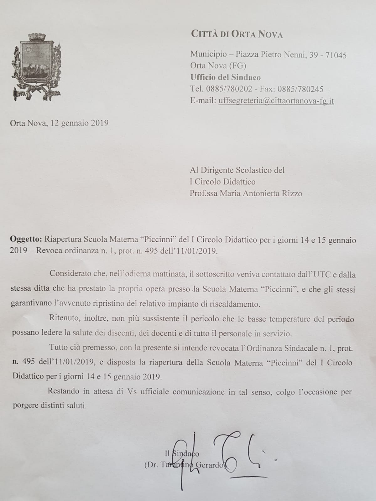 Dietrofront, lunedì la Scuola Materna di Via Piccinni sarà regolarmente aperta, a comunicarlo con una nota ufficiale il primo cittadino di Orta Nova Gerardo Tarantino, che ha informato la direzione didattica che i lavori di sistemazione dell’impianto di riscaldamento sono stati svolti regolarmente nella giornata di oggi, rendendo così fruibile l’istituto nella giornata di lunedì.