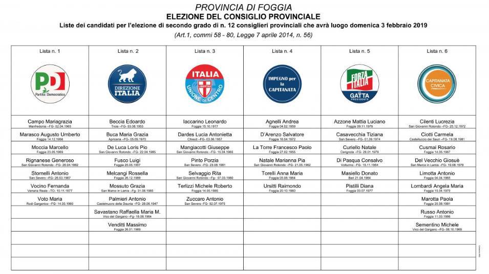 A distanza di tre mesi dall’elezione di Nicola Gatta a presidente della provincia, domenica sindaci e consiglieri dei comuni della Provincia di Foggia, saranno chiamati a rinnovare il consiglio provinciale. Si tratta di un elezione di secondo livello, pertanto riservata agli eletti nei consigli dei comuni di capitanata, 733 consiglieri e 58 sindaci, che potranno votare dalle ore 8:00 alle ore 20:00 di domenica presso la sede provinciale di Palazzo Dogana a Foggia. In corsa sei liste, il Partito Democratico, Direzione Italia, UDC, Impegno per la Capitanata, Forza Italia e Capitanata Civica. Nei Reali Siti candidato con Impegno per la capitanata l’assessore, nonchè consigliere carapellese Andrea Agnelli, e la consigliere comunale ortese Diana Pistilli, candidata per Forza Italia. Si tratta di elezioni strategiche in vista delle prossime amministrative, con centrodestra e centrosinistra impegnate a cercare soluzioni per ricucire diversi strappi soprattutto nel capoluogo di provincia e nella città di Orta Nova. Di seguito l’elenco con tutti i candidati.