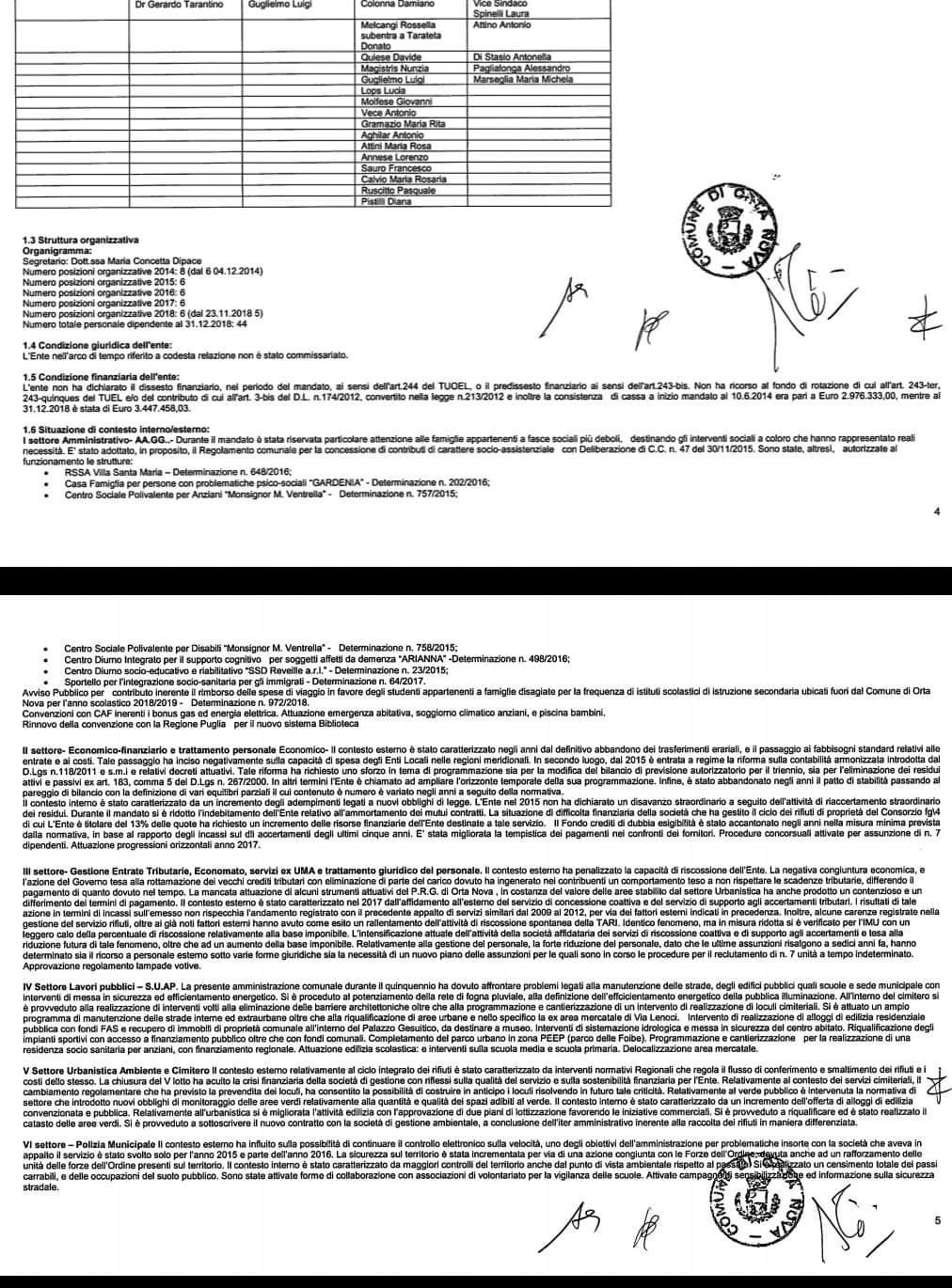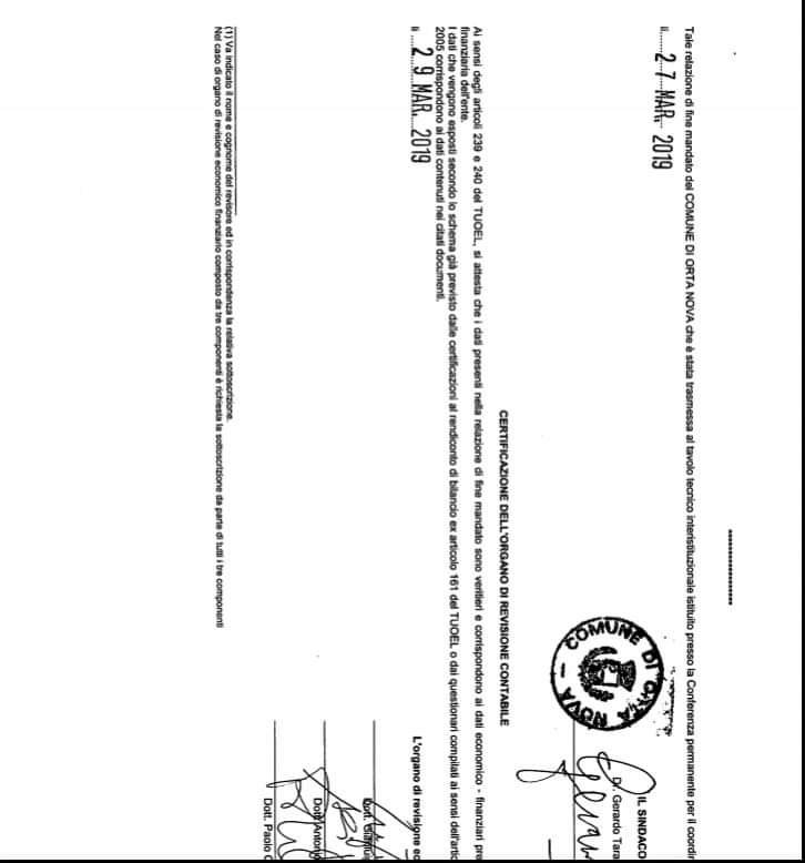 In data 29 marzo 2019 l’organo di revisione contabile ha firmato la relazione di fine mandato relativa al rendiconto di bilancio. Dalla relazione si evince intanto un incremento della consistenza di cassa rispetto all’inizio del mandato. Non poco trascurabile anche l’enorme lavoro fatto riservando particolare attenzione alle famiglie appartenenti a fasce sociali più deboli, destinando ad esse contributi di carattere socio assistenziale. In questi anni abbiamo permesso a molte strutture sociali di funzionare, anche nel settore economico-finanziario, settore lavori pubblici e urbanistica sono stati rilevati grandi miglioramenti nonostante i tanti problemi riscontrati a inizio mandato. Con orgoglio possiamo concludere, quindi che il risultato dell’esercizio dell’amministrazione Tarantino di questi cinque anni di mandato si conclude in positivo.