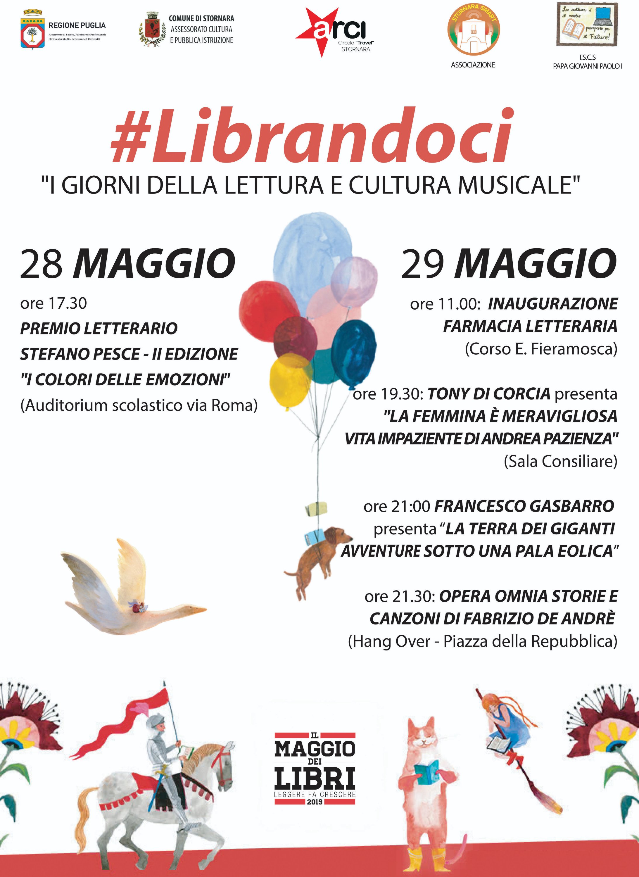 Incontri con autori, premio letterario, musica e promozione della lettura, daranno vita al progetto, “#Librandoci – i giorni della lettura e della cultura musicale”. La manifestazione organizzata, a Stornara, dall’ARCI “Travel”, in collaborazione con l’associazione Stornara Smart, l’ICS “Papa Giovanni Paolo I” e patrocinata dall’assessorato alla formazione della Regione Puglia e dall’assessorato alla cultura del comune di Stornara, martedì 28 e mercoledì 29 maggio, valorizza l’importanza della lettura in una delle regioni in cui si legge sempre meno. Martedì 28, apriremo la manifestazione con la seconda edizione del premio letterario “Stefano Pesce” presso l’auditorium scolastico di via Roma. Gli altri appuntamenti previsti sono quelli del 29 maggio con l’inaugurazione della prima “farmacia letteraria” ore 11 corso Stornara, alle ore 19, presso la sala consiliare, Tony Di Corcia presenta “La Femmina è meravigliosa: vita impaziente di Andrea Pazienza”, alle ore 20.30, in piazza della Repubblica, Francesco Gasbarro presenta “La Terra dei Giganti: avventure sotto una pala eolica”, a seguire “Opera Omnia – storie e canzoni di Fabrizio De Andrè” a cura di Matteo Fioretti.