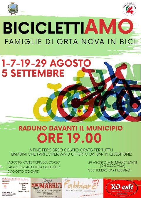 All’interno del cartellone dell’estate ortese abbiamo deciso di dedicare diversi appuntamenti all’utilizzo della bicicletta. L’obiettivo è educare, e sensibilizzare, tutti all’utilizzo dei mezzi non inquinanti. Si partirà giovedì 1 agosto dalle 19.00. Il raduno è fissato davanti al municipio. Successivamente ci saranno altre date come è evidenziato all’interno della locandina. A fine percorso sarà previsto un momento di ristoro con l’offerta, da parte dei bar indicati nella locandina, di gelati gratis ai bambini che avranno partecipato. In virtù di questo ci preme ringraziare l’associazione PantaniCRS per essersi messa a disposizione nel tracciare il percorso da seguire; e in più ringraziamo i bar: