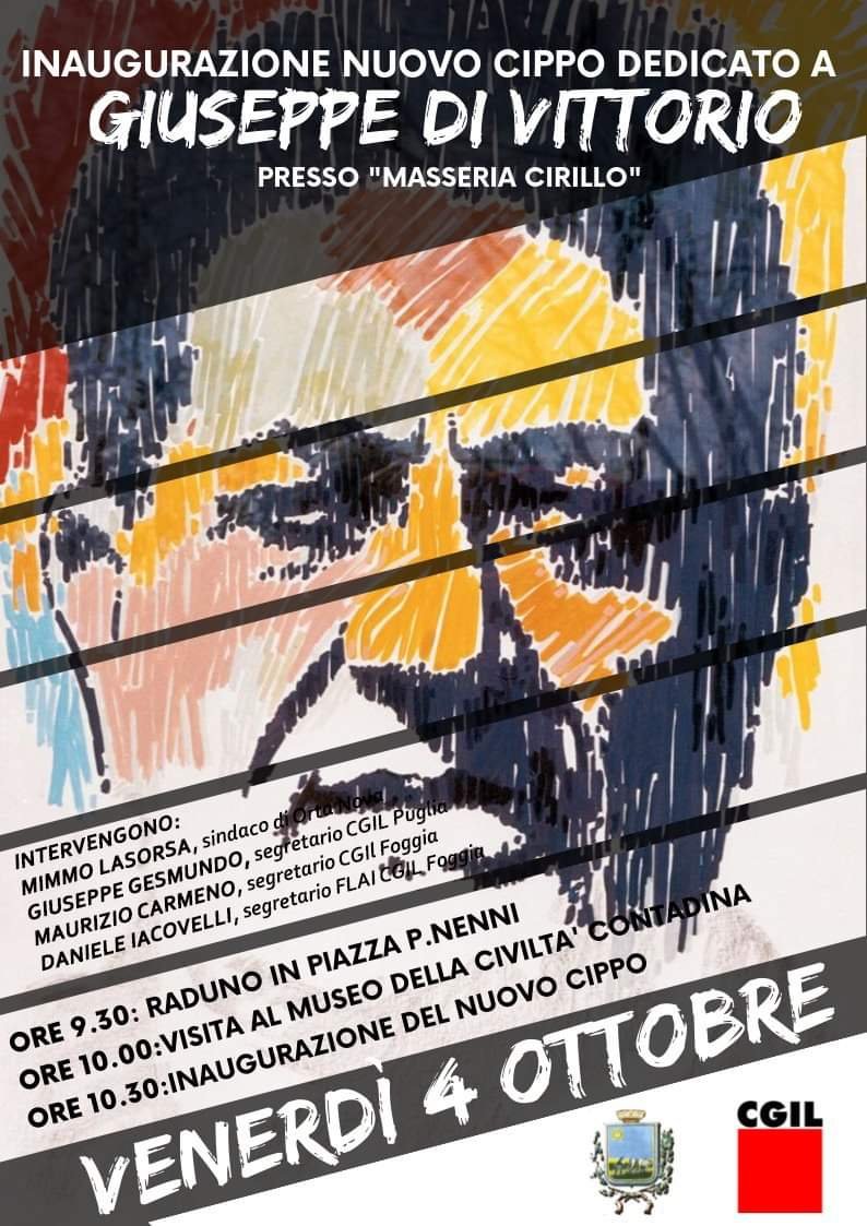 Finalmente dopo mesi verrà inaugurato il cippo dedicato a Di Vittorio, nei pressi della Masseria Cirillo. Grazie anche ai nostri consiglieri, che hanno allertato l’intera cittadinanza e non solo, il nostro territorio conserverà nuovamente la piccola stele dedicata ad uno più grandi sindacalisti del nostro Paese. Ma la nostra intenzione è quella di andare oltre e creare, insieme ad associazioni, sindacati ed amministrazione, un itinerario divittoriano che metta in luce non solo la figura di Giuseppe Di Vittorio, ma che crei anche consapevolezza sul tema del caporalato, piaga ancora presente nel nostro agro e che continua a mietere lavoratori sfruttandoli e vessandoli.