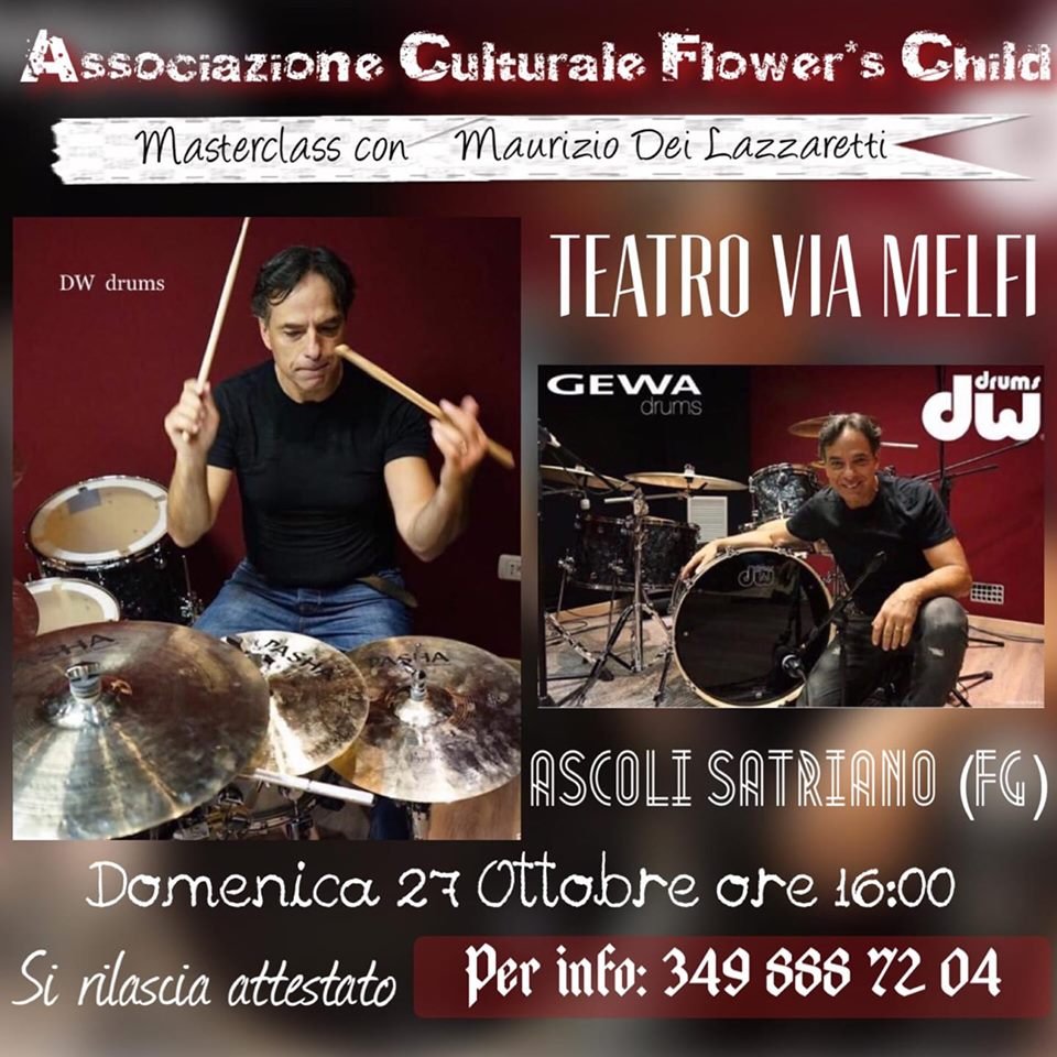 Continuano ad Ascoli Satriano gli appuntamenti, organizzati dalla Flower’s Child, con l’esibizione e le lezioni di batteristi di caratura internazionale. Ad esibirsi il 27 ottobre sarà Maurizio Dei Lazzaretti. Dall’edizione 2001 ad oggi suona nell’Orchestra della RAI, per il Festival di Sanremo. Inoltre il batterista leccese si è esibito con numerosi artisti internazionali (tra gli altri Ray Charles, Youssou N’Dour e Paul Young) ed italiani (tra gli altri Mina, Mango, Francesco De Gregori e Lucio Dalla). E’ un piacere per me avere come ospite nel mio paese il M° Dei Lazzaretti, ci dice Francesco Roccia – presidente dell’associazione organizzatrice, conosciuto da me personalmente durante la mia partecipazione al Festival di Sanremo del 2003. Ho deciso di organizzare questa masterclass perché dalla mia esperienza personale – continua Francesco – ho imparato che si cresce di più musicalmente cercando di vivere l’esperienza direttamente con gli artisti e soltanto così si fanno importanti passi avanti. L’idea scaturisce perché ho notato l’interesse fortissimo dei miei allievi verso i batteristi che potevano vedere tramite YouTube. Voglio dare loro l’opportunità di vivere la musica dei professionisti non più solo dalla rete, ma anche dal vivo, dando loro anche la possibilità di trascorrere la giornata con grandi batteristi ed interagire con loro.