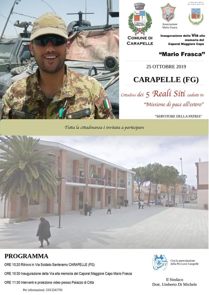È giunto il giorno dell’intitolazione di una strada a Mario Frasca, il caporal maggiore capo dell’esercito italiano, cittadino dei Cinque Reali Siti, che il 23 settembre 2011 perse la vita durante una missione di pace internazionale ad Herat, in Afghanistan. Venerdì 25 ottobre a Carapelle avrà luogo l’evento organizzato dall’amministrazione comunale con la collaborazione dell’Associazione Onlus “Mario Frasca”. Il programma prevede alle 10.20 il ritrovo in via Soldato Santeramo. Alle 10.30 verrà scoperta la targa indicante la Via Caporal Maggiore Capo Mario Frasca, poi ci si sposterà in processione verso la parrocchia della Beata Maria Vergine del Rosario per il picchetto d’onore ed infine, alle 11.30, dopo aver reso omaggio a tutti i caduti di Carapelle davanti al monumento in piazza Giovanni Paolo II, si procederà con la proiezione di un video e con gli interventi delle autorità e dei familiari a Palazzo di Città. Via Caporal Maggiore Capo Mario Frasca è una parallela di via Caduti di Nassiriya, alla periferia di Carapelle. Dedicare una strada ad un conterraneo caduto in una missione di pace, proprio come accadde ai militari italiani vittime dell’attentato di Nassiriya, fa parte di un progetto intitolato ”Una Via per Mario Frasca nel territorio dei Cinque Reali Siti’‘, che ha già visto un evento simile nei territori di Orta Nova ed Ordona.