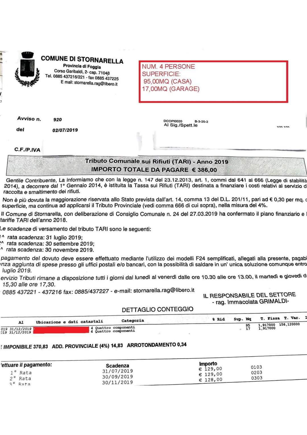 COMUNE DI STORNARELLA 5400 ABITANTI .. COSTO COMPELSSIVO TARI €1.008.000,00 QUINDI UN COSTO PER ABITANTE DI €186.66
