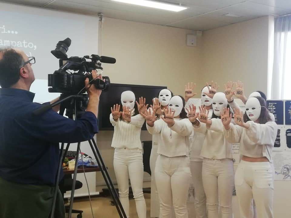 L’I.I.S. “A. Olivetti” ha deciso di aderire al percorso intitolato “Lascia che il vento racconti” dopo la pubblicazione su fb del post del direttore Gianni Di Giuseppe sulla pagina del circolo di lettura Kairos della Rai di Bari. Gli alunni dell’istituto sono stati guidati dalle prof. sse Giovanna e Maria Francesca Di Pietro, rispettivamente docenti di Lingua e Cultura inglese e di Lingua e Letteratura italiana, ed ha coinvolto allievi iscritti ai diversi indirizzi dell’istituto. Dopo aver letto il libro, la docente d’inglese Giovanna Di Pietro e i suoi alunni hanno selezionato le pagine più significative del romanzo di Melville, scegliendo come chiave di interpretazione dell’opera quella del ‘mostro’ come metafora dell’ossessione. Successivamente i ragazzi, guidati dalla docente, hanno effettuato una trasposizione lirica dei passi individuati utilizzando le tecniche del caviardage, del cut-up, della magnetic poetry, e contaminando la scrittura con altre tecniche artistiche, quali il collage, il disegno, la pittura, il ricamo. Il lavoro è stato realizzato in formato cartaceo e digitale e corredato da un’ampia documentazione fotografica. Tali poesie aprono e chiudono la riscrittura lirico-teatrale realizzata dalla docente di Lettere, Maria Francesca Di Pietro, insieme con i suoi alunni. All’interno della sceneggiatura, Moby Dick viene reinterpretata in chiave simbolica come elemento dionisiaco, imprevedibile, minaccioso, desiderato insieme e temuto, rovello interiore che conduce l’uomo alla perdita di sé e della ragione. In tale interpretazione, la balena è la natura, è il femminile, difficilmente irreggimentabile all’interno dell’ordine ‘apollineo’ inutilmente ricercato da Achab. Moby Dick, rappresentata sulla scena da un coro di ragazze vestite di bianco e con una maschera sul volto, recita una litania lirica e proclama le proprie ossessioni in forma di preghiere, che vengono lette dalle allieve sul palmo delle mani. Ogni ossessione è una poesia scritta dagli alunni ed è, insieme, anche l’attualizzazione del mostro interiore di Moby Dick, poiché rappresenta un loro tormento o un loro desiderio. Una delle ossessioni è recitata unicamente in lingua inglese, un’altra viene invece rappresentata a voci alternate come nell’eco della risacca marina. Gli alunni hanno anche curato gli aspetti tecnici, relativi ai fondali scenici, agli effetti sonori, alle musiche, agli oggetti di scena, ai costumi; alcuni dei brani strumentali vengono eseguiti dal vivo con tromba e chitarra.