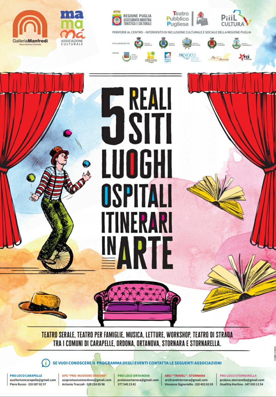 Il bando ‘Periferie al centro’ ha raccolto 50 progetti artistico-culturali di attività di spettacoli dal vivo ed iniziative culturali collaterali scegliendone 20 che dovevano coinvolgere sia le periferie geografiche della regione Puglia che le periferie sociali e culturali. Da marzo a giugno 2020 si terranno una serie di eventi nei 5 reali siti: dal teatro famiglia, al serale, a matinèe per le scuole, alla musica, al teatro di figura, al festival di strada ecc. non mancheranno laboratori di clownerie, e di lettura. I luoghi deputati saranno molti: l’ auditorium di Carapelle (che verrà inaugurato il 7 marzo), l’ex gesuitico di Orta Nova, il museo di Ordona, la piazza della Repubblica di Stornara, l’auditorium Aldo Moro di Stornarella e tanti altri. La geografia del territorio sarà parte importante di questo progetto, perchè tutte le attività si snoderanno nei 5 comuni, nei quali i cittadini si muovera spostandosi dall’uno all’altro territorio, come se fossero quartieri di una grande città. Gli eventi saranno tutti gratuiti.