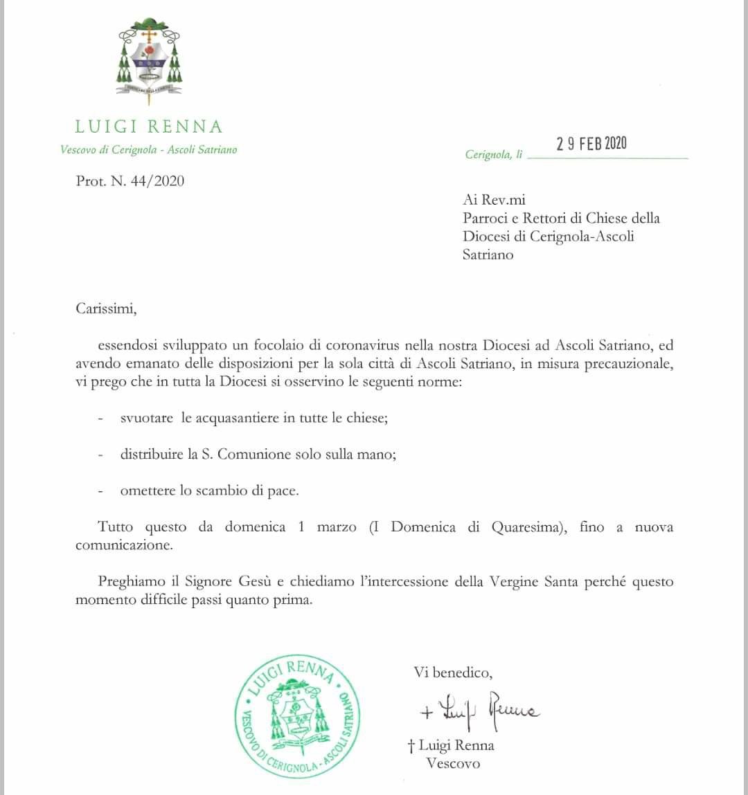 È notizia di ieri relativa all’isolamento disposto dall’ASL per diciassette cittadini di Ascoli Satriano, che dal 21 al 24 Febbraio scorso, sarebbero stati in contatto con un cittadino proveniente da Soresina, in provincia di Cremona, risultato positivo al Coronavirus, che la Diocesi di Cerignola-Ascoli Satriano ha disposto, a partire da oggi fino a nuova comunicazione, lo svuotamento in tutte le parrocchie della diocesi delle acquesantiere, omettendo inoltre lo scambio del segno di pace, ed invitando i parroci a servire la comunione solo sulla mano. Le misure, comunicate dal Vescovo SSEE Luigi Renna, sono state emanate nella giornata di ieri quale misura precauzionale. Di seguito il documento inviato alle parrocchie.