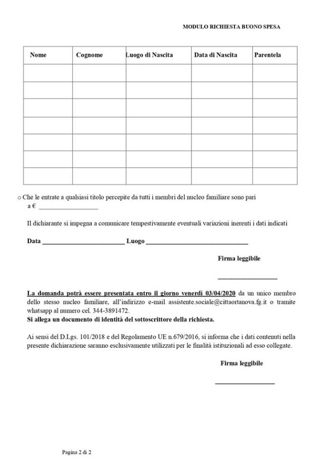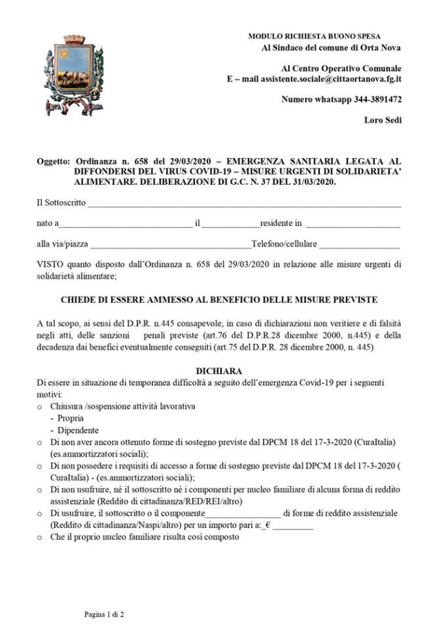 Dopo le polemiche di ieri, questa mattina con la delibera di giunta n.37 sono stati stabiliti i criteri per l’assegnazione dei buoni spesa stanziati dal Governo, per far fronte all’emergenza Coronavirus. Nella mattinata alcuni momenti di tensione si sono verificati presso il municipio, dove una folla di circa 50 persone si è riversata inutilmente allo scopo di chiedere informazioni, senza considerare la chiusura al pubblico degli uffici comunali, ed il divieto di assembramento. Nella delibera la Giunta ha stabilito i criteri per poter accedere al contributo, il richiedente dovrà infatti comunicare la chiusura o la sospensione della propria attività lavorativa, di non aver ancora ottenuto contribuzioni stanziate con il decreto “Cura Italia”, di non usufruire di Reddito di Cittadinanza, ammortizzatori sociali, RED, REI. Il valore del buono spesa sarà pari a 300 euro per ogni nucleo familiare, che sarà aumentato di 50 euro per ogni minore. Il termine ultimo per la presentazione delle richieste è fissato entro il giorno venerdì 03/04/2020, le domande dovranno essere inviate all’indirizzo di posta elettronica: assistente.sociale@cittaortanova.fg.it, o su whatsapp al n.344 3891472, utilizzando il modulo che riportiamo di seguito.