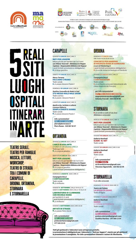 Si torna in scena. Dopo lo stop forzato dovuto all’emergenza Covid-19, nei Cinque Reali Siti riecco il teatro serale, il teatro per famiglie, ma anche letture, workshop, teatro di strada. Tutto questo grazie al bando regionale “Periferie al Centro – Intervento di inclusione sociale della Regione Puglia”, con il progetto ‘5 Reali Siti, luoghi ospitali, itinerari in arte’.