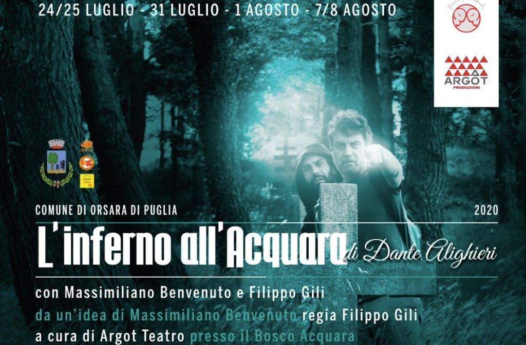 Adesso è davvero tutto pronto. “L’Inferno di Dante Alighieri” sta per trovare dimora nel Bosco Acquara, a Orsara di Puglia, con i reading letterari organizzati dal Comune di Orsara di Puglia in collaborazione con Argot produzioni. Agli spettacoli si può assistere gratuitamente, ma con prenotazione obbligatoria contattando il 347.2355349 o inviando una email all’indirizzo infopointorsaradipuglia@gmail.com. Il primo evento de “L’Inferno all’Acquara” si terrà venerdì 24 luglio, alle ore 18. Gli attori Massimiliano Benvenuto e Filippo Gili, in questo primo appuntamento, rileggeranno e interpreteranno dal primo al quinto canto dell’Inferno.Sabato 25 luglio, invece, stesso orario e medesima location, per i canti dal sesto al decimo. Nelle serate successive, saranno riletti e interpretati tutti gli altri. Questo significa che, per chi ne ha voglia e possibilità, l’ideale sarebbe assistere a tutto il ciclo dei reading che si terranno anche l’1, il 7 e l’8 agosto. Si tratta di un evento totalmente inedito. All’interno di una bellissima radura del Bosco Acquara, a Orsara di Puglia, saranno posizionate le sedute per gli spettatori, opportunamente distanziate. Massimiliano Benvenuto e Filippo Gili daranno voce, alternativamente, a Dante e Virgilio, ma anche ai dannati dei gironi danteschi.