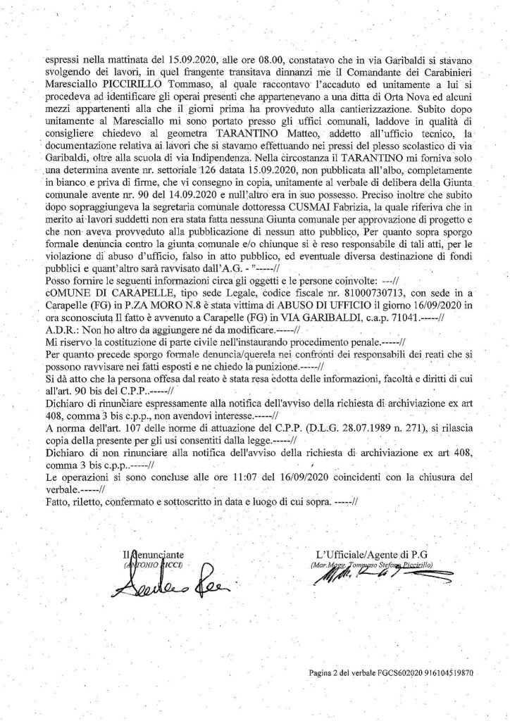oggi ho provveduto a sporgere denuncia per la esecuzione di lavori pubblici sul nostro territorio in assenza di atti propedeudici allo svolgimento degli stessi. In questo momento i lavori sono bloccati fino a quando non si procederà alla regolarizzazione degli stessi.