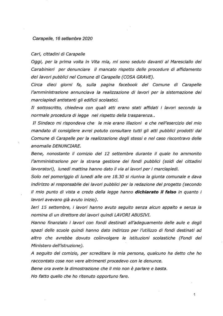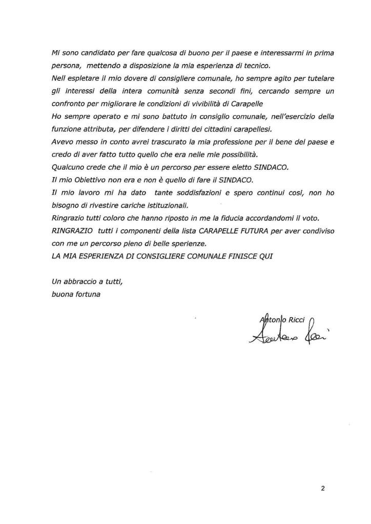 Perchè nessuno possa pensare che attendo le dimissioni del sindaco per candidarmi alle prossime elezioni. Oggi ho rassegnato le dimissioni da consigliere comunale, serenamente.Seguirò, come semplice cittadino, lo sviluppo delle indagini per la denuncia fatta.Ringrazio tutti gli amici che hanno riposto in Me e nella lista CARAPELLE FUTURA la loro fiducia.spero possiate capire la mia sceltada oggi mi dedicherò pienamente al mio lavoro e auguro il meglio a tutti.