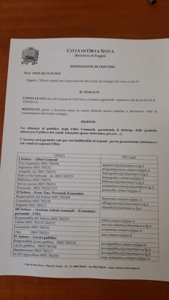 Continua a preoccupare l’emergenza Covid-19 ad Orta Nova, il comune capofila dei Reali Siti da venerdì scorso è stato inserito nella zona rossa del bollettino epidemiologico diffuso dalla Regione Puglia. Sono infatti più di cinquanta i casi positivi, mentre sarebbero un centinaio le persone sottoposte alla quarantena. Cinque le classi chiuse a scopo precauzionale nei vari istituti scolastici ortesi, mentre anche nella casa di riposo Suore di San Tarcisio, si sarebbero registrati dei casi di positività. Nelle ultime ore il sindaco Domemico Lasorsa, ha chiuso gli uffici comunali per permettere la sanificazione dei locali, stessa cosa sarà fatta nei prossimi giorni con le scuole ed il comando dei vigili urbani. In un videomessaggio il sindaco ha inoltre invitato i cittadini al rispetto delle regole di protezione individuale, chiedendo inoltre l’intervento dei militari.