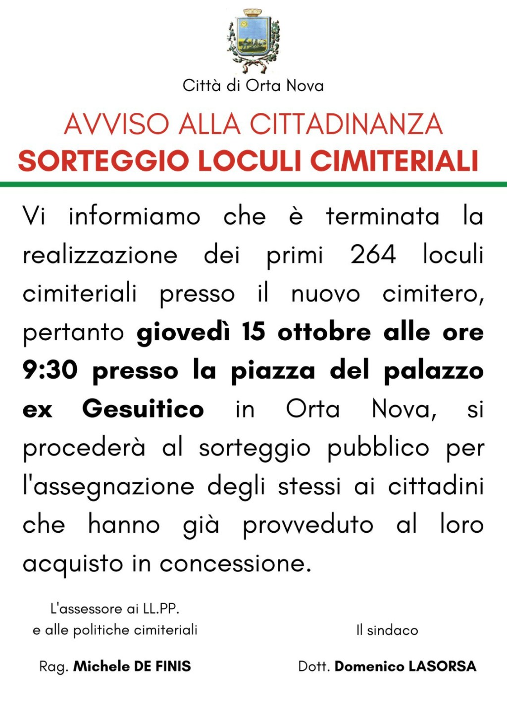 Mentre Orta Nova è stata da poco bollata dalla Regione Puglia come “zona rossa”, poiché risultata tra i comuni con il più alto numero di contagi Covid, il sindaco Lasorsa organizza una estrazione di piazza per l’assegnazione di 264 loculi cimiteriali.
