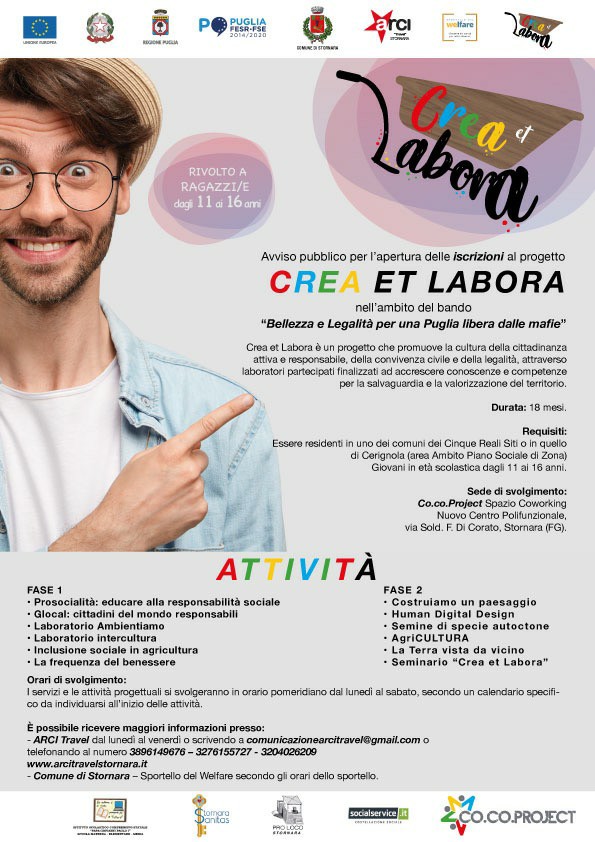 𝐂𝐫𝐞𝐚 𝐞𝐭 𝐋𝐚𝐛𝐨𝐫𝐚 è il nuovo progetto vincitore del bando della Regione Puglia “Bellezza e Legalità” che promuove la cultura della cittadinanza attiva e responsabile, della convivenza civile e della legalità, attraverso laboratori partecipati finalizzati ad accrescere conoscenze e competenze per la salvaguardia e la valorizzazione del territorio.