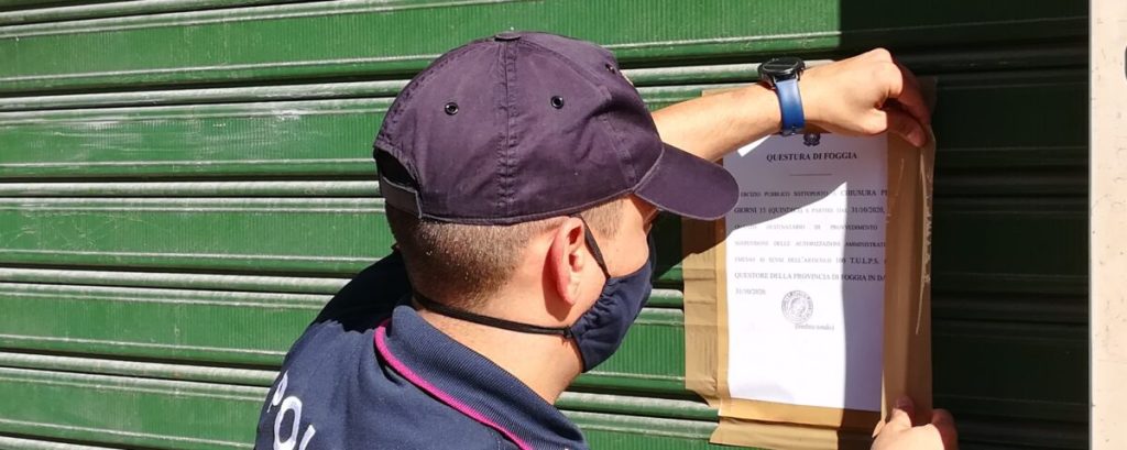 Nell’ambito dell’attività finalizzata a verificare il rispetto delle normative anti COVID, nonché alla prevenzione e contrasto degli assembramenti causati dalla cd MOVIDA, in data odierna Agenti della Polizia Amministrativa della Questura di Foggia hanno provveduto alla notifica di due decreti, redatti ai sensi dell’ex art.100 T.U.L.P.S., ai gestori di altrettante attività commerciali, una situata nella periferia di Foggia, l’altra nel centro storico cittadino, responsabili di condotte lesive della pubblica sicurezza, tenute in totale disinteresse per l’incolumità degli avventori e in violazione delle vigenti disposizioni per il contenimento della pandemia da COVID – 19. Le licenze per la somministrazione di alimenti e bevande previste dalla SCIA comunale di queste attività commerciali sono state sospese rispettivamente per giorni 90 e giorni 15. La durata della prima sospensione è stata determinata dalla reiterazione dell’inosservanza del provvedimento, già inizialmente applicato a luglio scorso con una durata di giorni 60 per avere tenuto una serata in struttura priva delle necessarie autorizzazioni di agibilità e con un cospicuo numero di partecipanti senza il rispetto di alcuna distanza di sicurezza e la maggior parte priva dei necessari dispositivi di protezione individuale, dimostrando così anche spregio per i provvedimenti dell’Autorità; mentre, la sospensione della licenza per giorni 15 è stata comminata per inosservanza degli orari di chiusura previsti dal D.P.C.M. attualmente in vigore. Per il gestore di quest’ultima attività, si è ritenuta inevitabile anche la denuncia per mancata indicazione delle proprie generalità, minaccia e resistenza a P.U. a causa del comportamento tenuto durante l’accertamento della violazione verso gli agenti operanti.