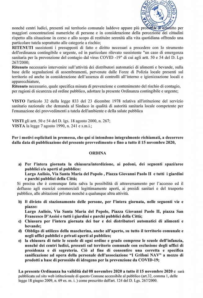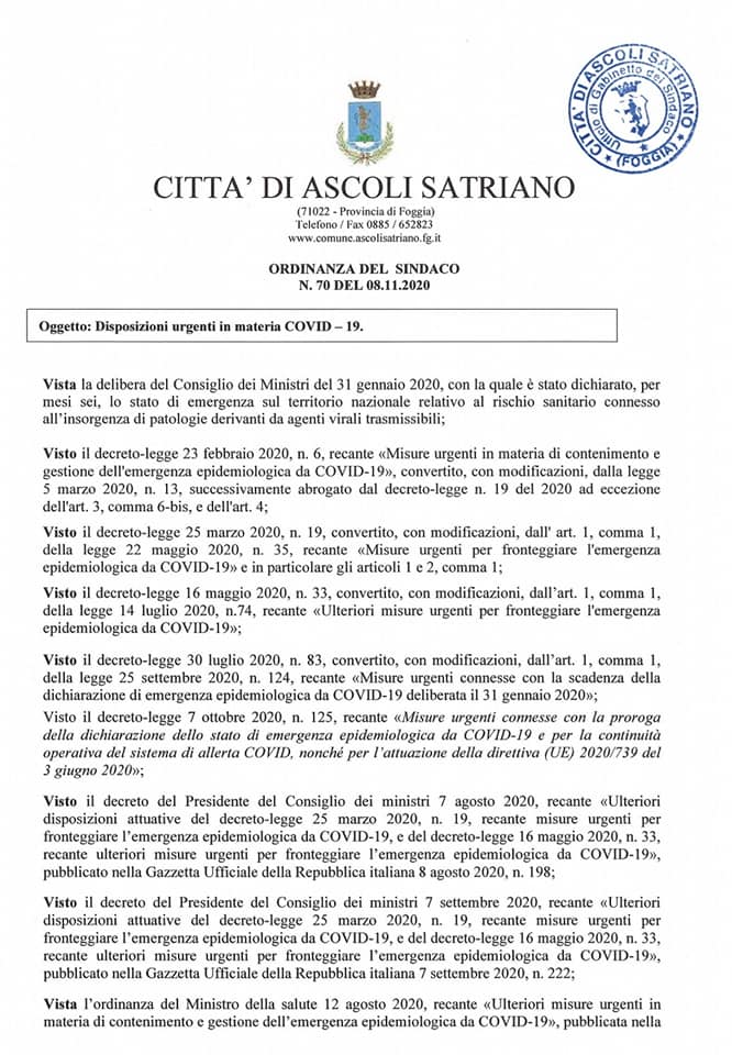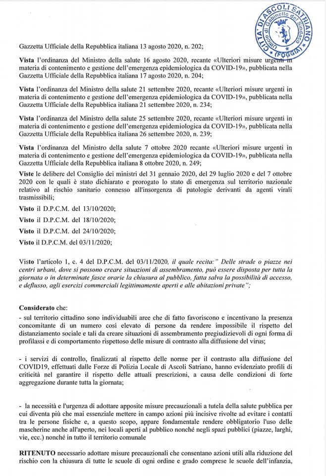 In un video su Facebook, il sindaco di Ascoli Satriano, Vincenzo Sarcone, ha chiarito la situazione relativa all’emergenza Covid-19 nel comune dauno. Negli ultimi giorni la cittadina del subappennino dauno, si era allarmata per la collocazione nella fascia superiore a 20 casi nel bollettino epidemiologico pubblicato dalla Regione Puglia, ma il primo cittadino ha chiarito che in riferimento ai dati comunicati venerdì scorso dalla Prefettura di Foggia, nella città dei grifoni, ci sarebbero attualmente 14 casi positivi relativi a cittadini residenti, 5 positivi domiciliati ma non residenti, e 30 cittadini in quarantena. Secondo il sindaco Sarcone nei dati ci sarebbero ritardi e confusione, legata a casi relativi a cittadini positivi residenti o domiciliati, come in alcuni casi che riguardano ricoverati presso strutture ospedaliere. Il sindaco Sarcone ha poi evidenziato come i primi risultati relativi agli esami svolti in questo weekend, lascino immaginare una situazione non felice, per questo il primo cittadino ascolano, ha emesso una ordinanza, che a partire da oggi fino al prossimo 15 Novembre, vedrà la chiusura di diverse aree del centro, la chiusura di bar e distributori automatici, l’obbligo di utilizzo della mascherina su tutto il territorio comunale e la chiusura di tutte le scuole di ogni ordine e grado, fino a quando non sarà effettuata la sanificazione. Infine il sindaco Sarcone ha rivolto un accorato appello ai concittadini, chiedendo ad ognuno di dare una mano per superare questa situazione, di seguito il testo dell’ordinanza.