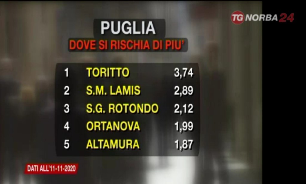 Orta Nova tra le più colpite in Puglia, è quanto emerso nella puntata de “Il Graffio”, la trasmissione di approfondimento di Telenorba, condotta dal Direttore Enzo Magista’. Sarebbero 346 i casi totali di Covid-19 registrati nel comune capofila dei Reali Siti, al 24°posto nella classifica dei comuni più colpiti in Puglia. Secondo quanto ricostruito nella stessa trasmissione, Orta Nova sarebbe addirittura a 1,99 casi ogni 100 abitanti al quarto posto assoluto in Puglia dopo Toritto (3,74), San Marco in Lamis (2,89), San Giovanni Rotondo (2,12). Un dato allarmante, che dimostrerebbe come la contagiosita’ resti molto alta, ma dove restano poche le misure adottate a livello locale. In altri comuni limitrofi, con molti meno casi, sono state adottate ulteriori misure rispetto a quelle previste dall’ultimo DPCM, come ad esempio la chiusura delle scuole, la sanificazione degli Istituti scolastici, avvenuta una sola volta e con abbondante ritardo, la chiusura di vie e piazze, campagne di screening, ed altre limitazioni che in diversi casi hanno mantenuto più basso il livello di contagio, oltre ai notevoli ritardi nella comunicazione dei dati ufficiali, di seguito il servizio diffuso su Tg Norba 24.