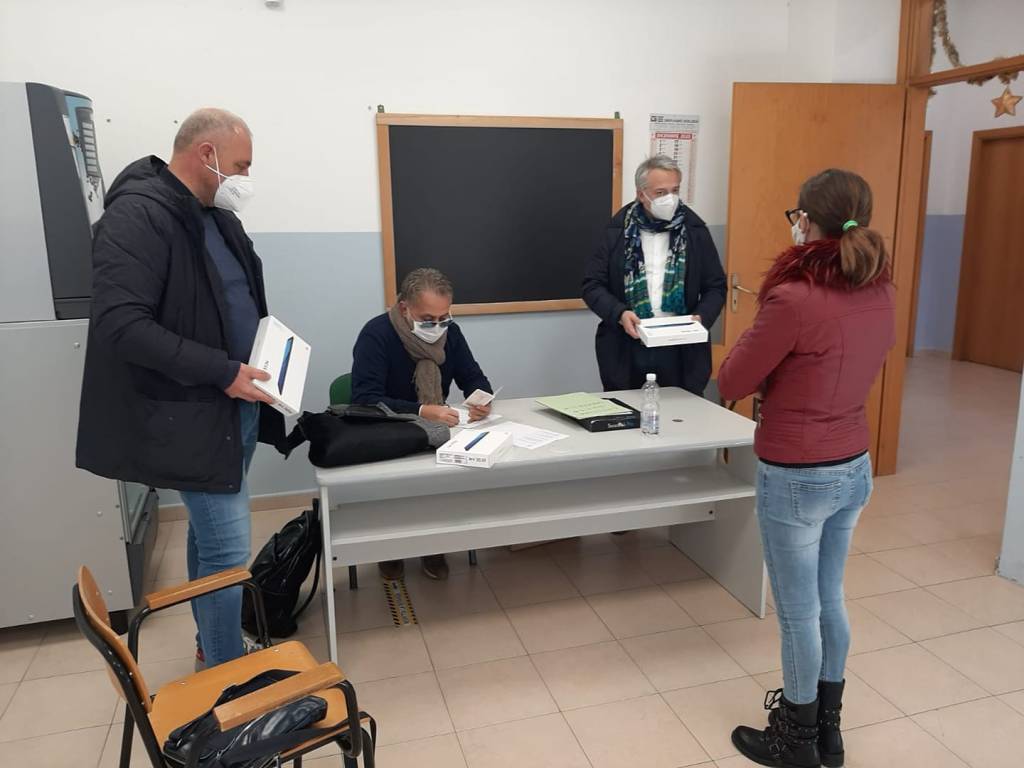 Tredici alunni del liceo linguistico di Carapelle, sede distaccata dell’istituto Olivetti di Orta Nova, hanno ricevuto questa mattina altrettanti tablet, per poter partecipare alla didattica digitale integrata. A consegnare i dispositivi c’erano il sindaco di Carapelle Umberto Di Michele, il vicesindaco Ulderico Spinapolice e il professor Alfredo Coppola, funzione strumentale alunni. All’iniziativa, che ha visto accontentati tutti gli alunni che ne hanno fatto richiesta, ha collaborato anche il professor Giuseppe Guglielmetti, responsabile della sede carapellese. Presto al linguistico verranno consegnati anche i libri di testo in comodato d’uso gratuito. L’istituto sta accontentando tutti i ragazzi, che possono seguire le lezioni nel migliore dei modi, nonostante l’emergenza Covid.