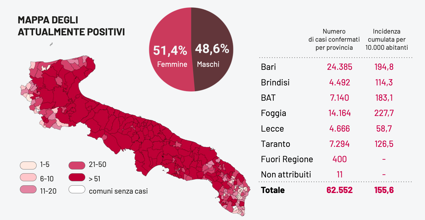 A partire da domani la Puglia tornerà in zona gialla, nel frattempo nella giornata di oggi è stato toccato il record assoluto regionale di contagi da Covid-19, 1884 nuovi casi a fronte di 10.119 test eseguiti, pari al 18,61% di positivi rispetto ai tamponi effettuati, quasi il doppio rispetto alla media nazionale che si attesta intorno al 10%. Il Ministro della Salute, Roberto Speranza, sulla base del monitoraggio settimanale a cura del Comitato Tecnico Scientifico, ha deciso di abbassare il livello di guardia collocando la Puglia nelle regioni a basso rischio, sulla base di un RT regionale che si attesta a 0,89. Ad influire sul numero elevato di contagi i 629 test positivi in provincia di Bari, ma torna a crescere però anche la provincia di Foggia, che si attesta a 444 casi, dopo un calo rilevato negli ultimi giorni. Contrario alla zona gialla il presidente della Regione Puglia, Michele Emiliano, che in diversi post su Facebook pubblicati nella giornata di ieri, prima sottolinea i risultati della sanità pugliese, ricevendo però le critiche di diversi utenti del web, a causa di diverse criticità emerse in questa seconda ondata, poi sottolinea come sarebbe forse stato il caso di attendere per l’istituzione della zona gialla. Scettico rispetto alla decisione del Ministro Speranza anche il presidente della provincia di Foggia, Nicola Gatta, che in un video su Facebook ha manifestato le proprie perplessità rispetto alla scelta del ministero, ribadendo come solamente qualche settimana fa si pensò addirittura alla zona rossa. Sempre sui social il presidente Emiliano non ha escluso ulteriori restrizioni per la provincia di Foggia e la BAT, ipotesi scongiurata qualche ora prima dall’Ass.re alla sanità della regione Pierluigi Lopalco, che aveva previsto una riduzione dei contagi in Puglia a partire dai prossimi giorni, escludendo l’ipotesi di zone rosse per la Capitanata e per la provincia di Barletta, Andria, Trani. C’è da augurarsi che le previsioni del CTT e di un illustre virologo, qual è il Prof. Lopalco, si tramutino in una rapida discesa della curva, che nella giornata di oggi sembra aver raggiunto il tanto atteso plateu.
