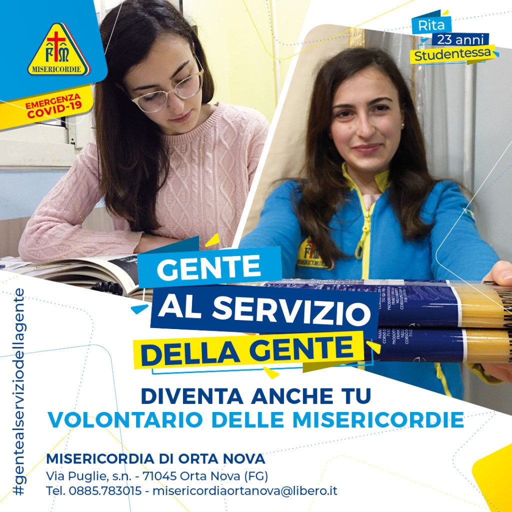 “Bastano poche ore di impegno quotidiano, ad esempio, per portare la spesa o i farmaci alle persone più deboli o in quarantena, per trasportare gli anziani a fare terapie, analisi, visite mediche, o anche solo rispondendo alle telefonate dei cittadini in difficoltà” – afferma il Governatore della Misericordia di Orta Nova, Giuseppe Lopopolo. “Così si alleviano tante sofferenze che altrimenti rimarrebbero senza alcuna risposta”.